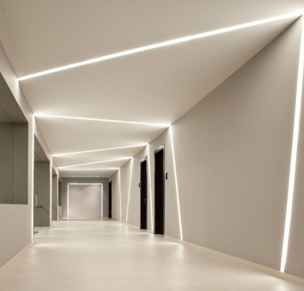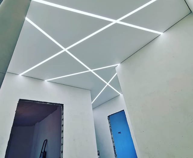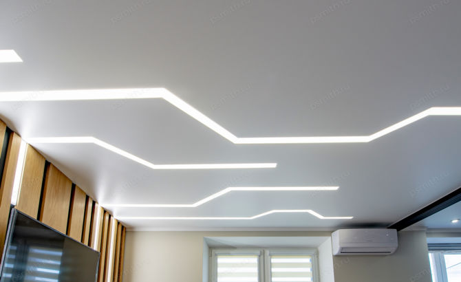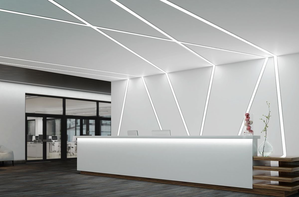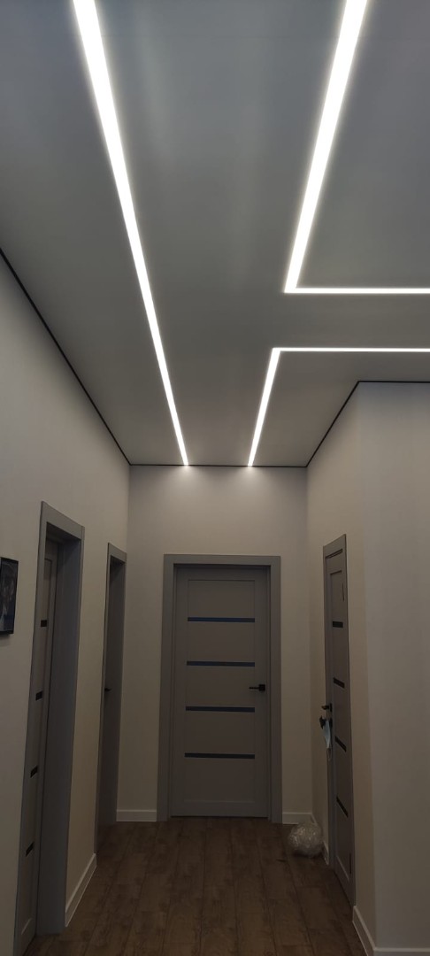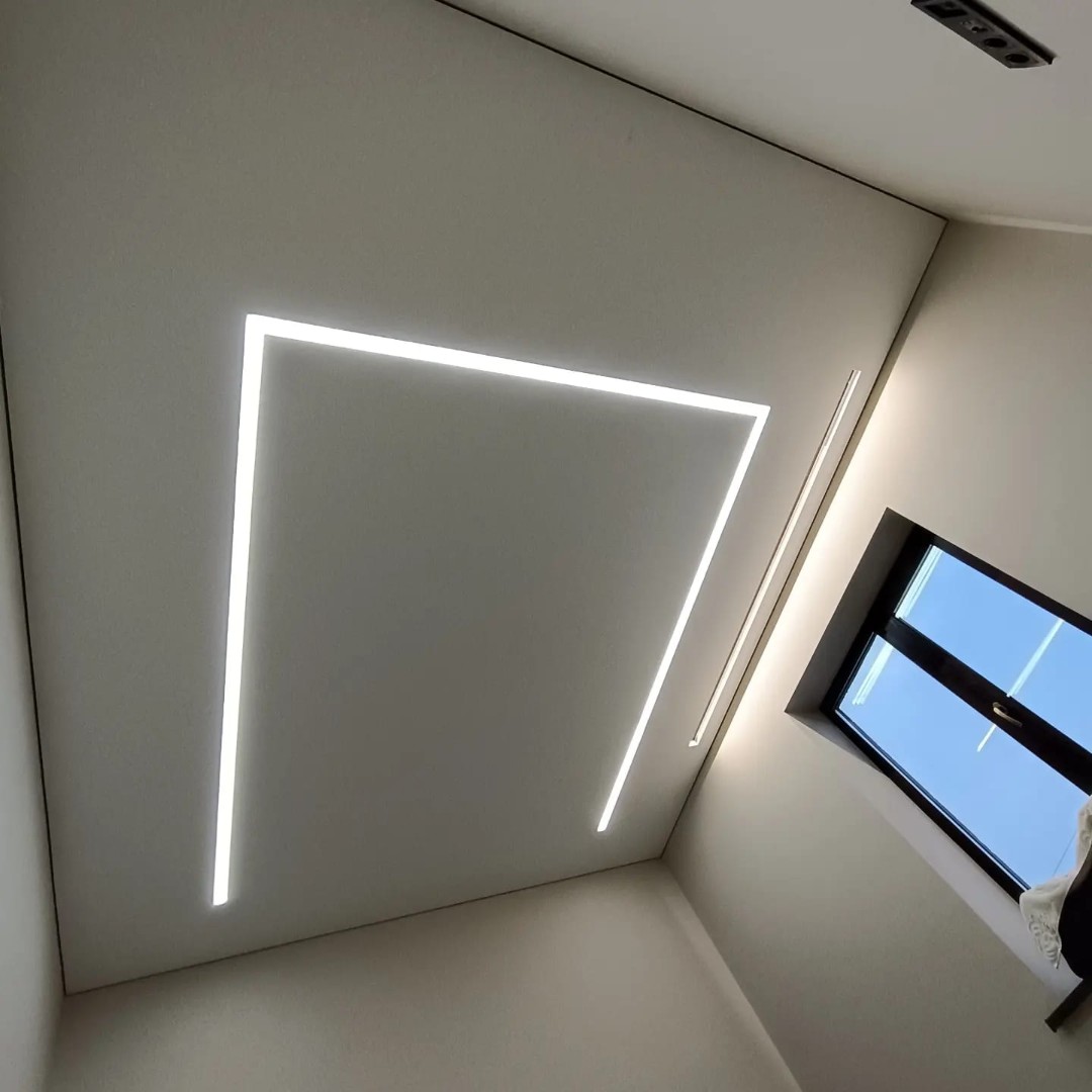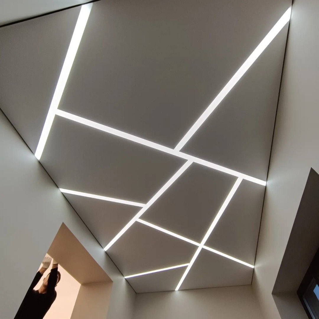 Это инновационная система освещения, при которой мощные светодиодные ленты устанавливаются в специальные алюминиевые профили, интегрированные в плоскость натяжного или гипсокартонного потолка. Результат — идеально ровные, светящиеся полосы, которые могут располагаться в любом направлении: от стены до стены, пересекаться под разными углами или переходить с потолка на стены.