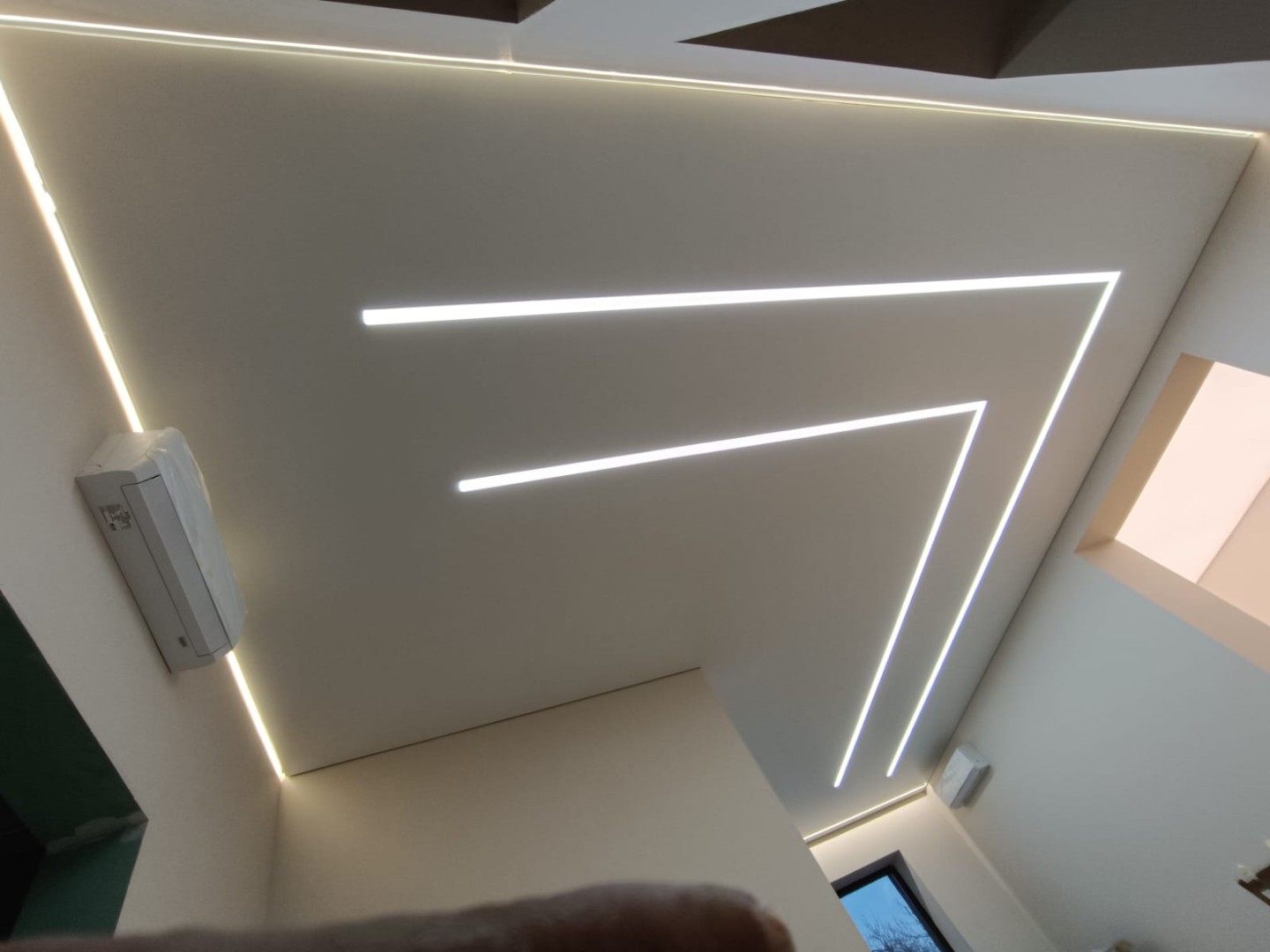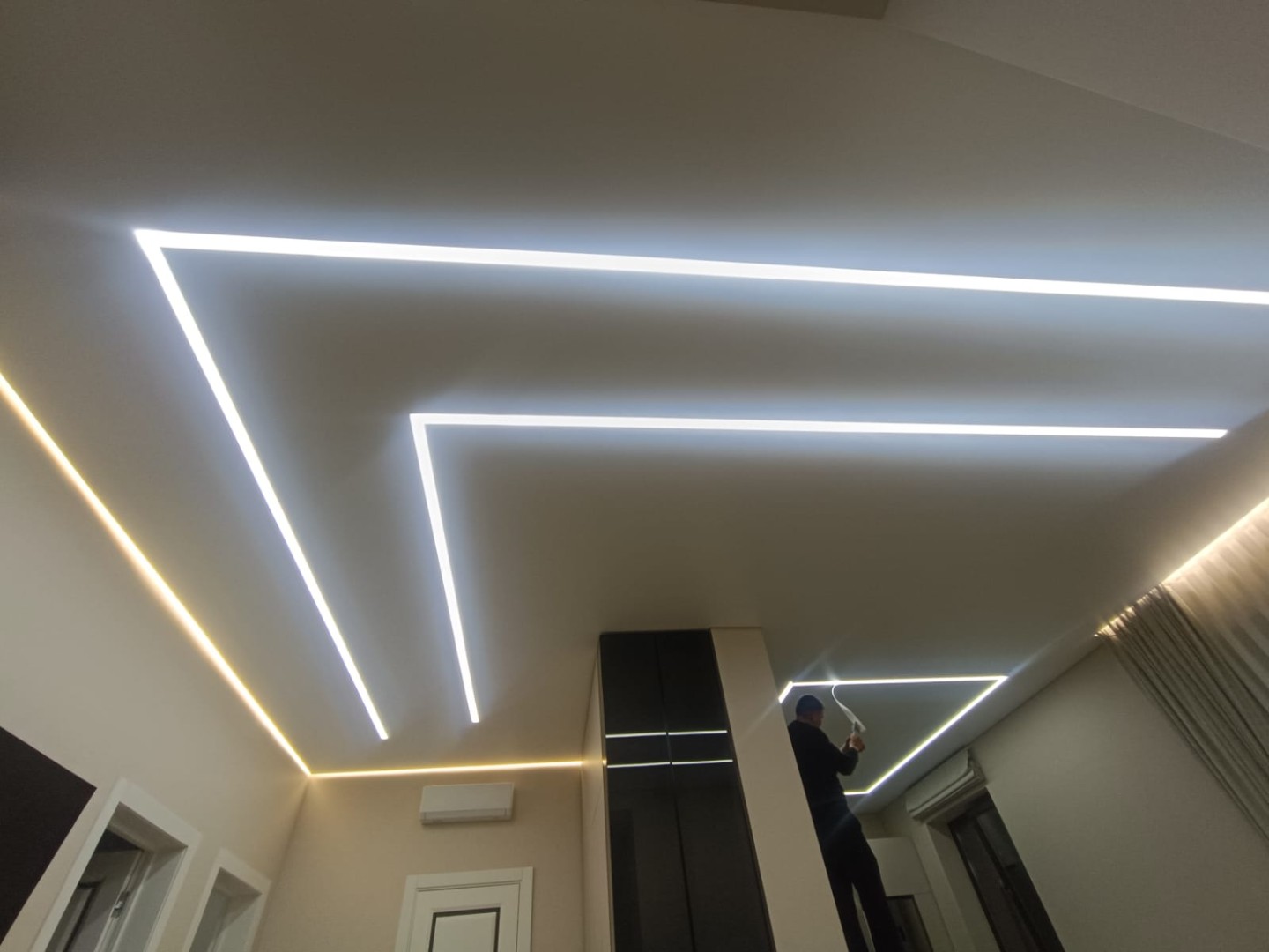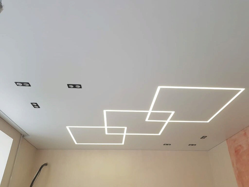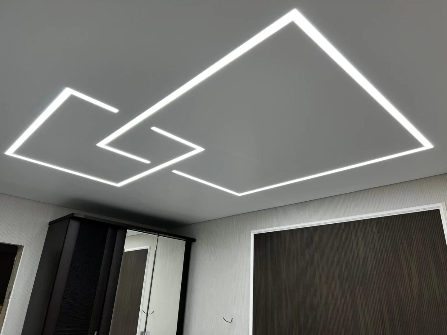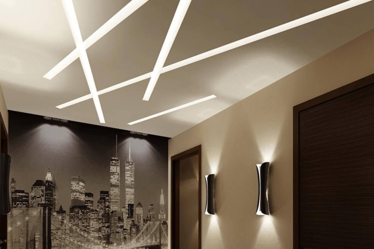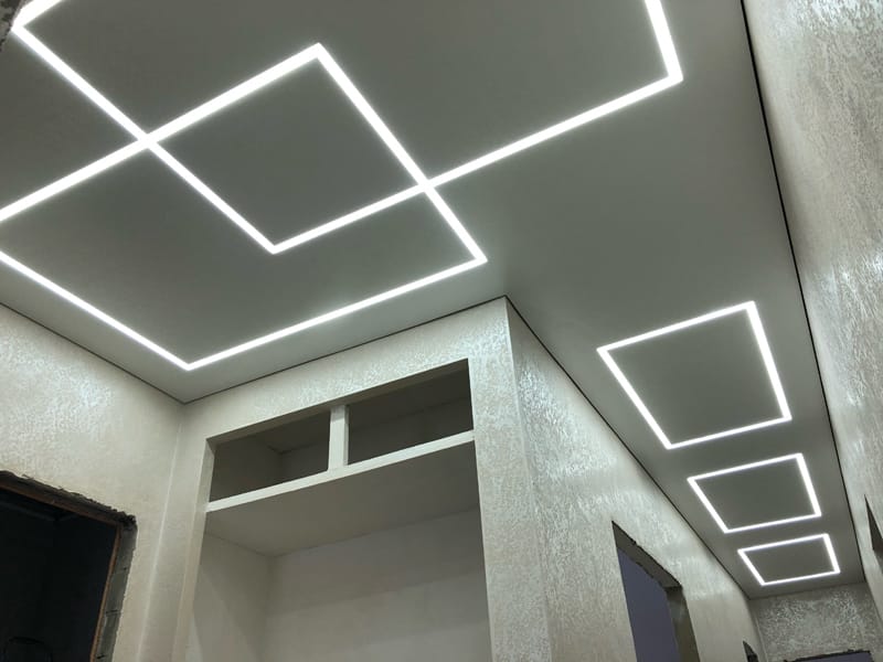 Это инновационная система освещения, при которой мощные светодиодные ленты устанавливаются в специальные алюминиевые профили, интегрированные в плоскость натяжного или гипсокартонного потолка. Результат — идеально ровные, светящиеся полосы, которые могут располагаться в любом направлении: от стены до стены, пересекаться под разными углами или переходить с потолка на стены.