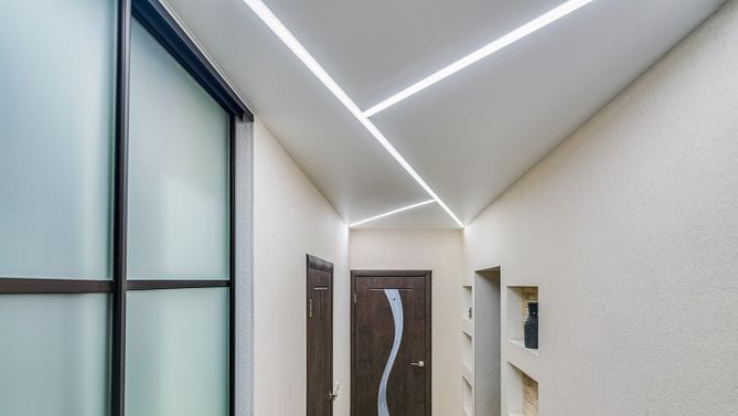 Визуальное зонирование. С помощью линий света легко разделить помещение на функциональные зоны (например, отделить кухню от столовой) без использования лишних перегородок.